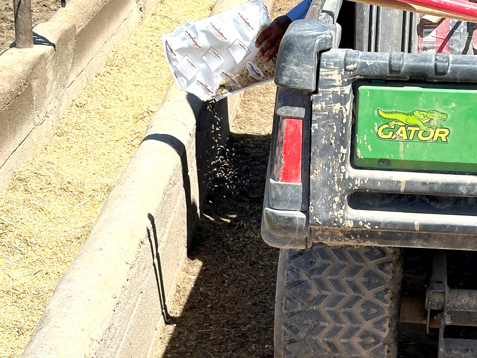 Our feed yard uses natural pest management by employing parasitic wasps, which are crucial for regulating fly control and creating a healthy environment.
